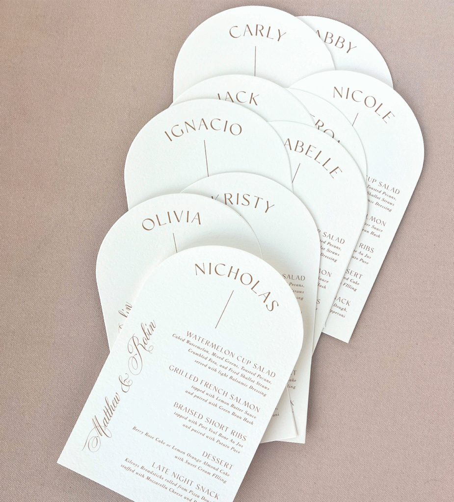 Browse our distinct collection of semi-custom wedding stationery, luxury wedding day paper, and laser cut goods. These beautiful paper goods are sure to leave a lasting impression on your special day. We offer everything from traditional invitations to personalized menus and signage, with every item handcrafted in-house.