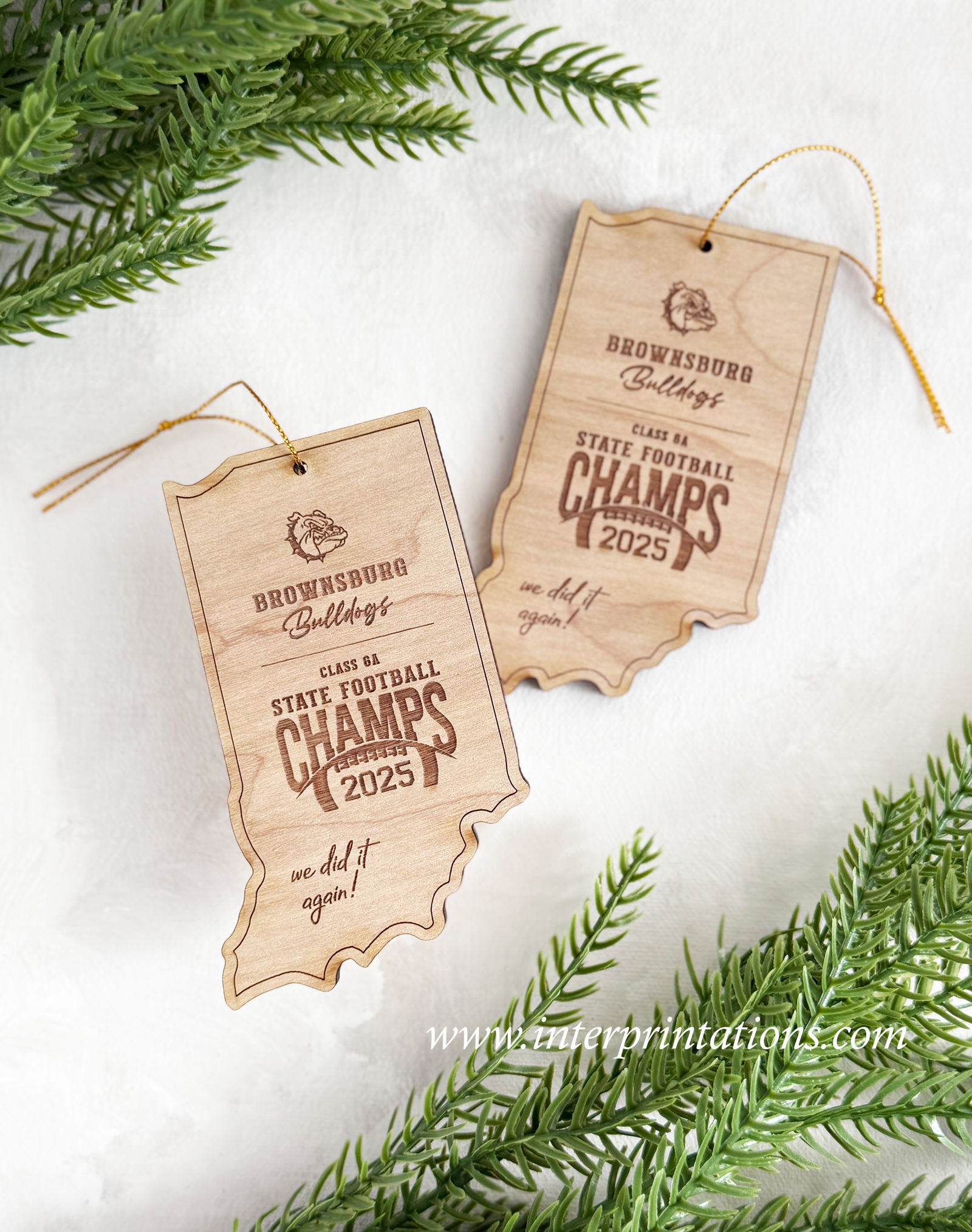 This laser-cut and engraved ornament honors the Brownsburg Bulldogs’ 2025 Class 6A State Football Championship — a moment worth remembering for years to come.