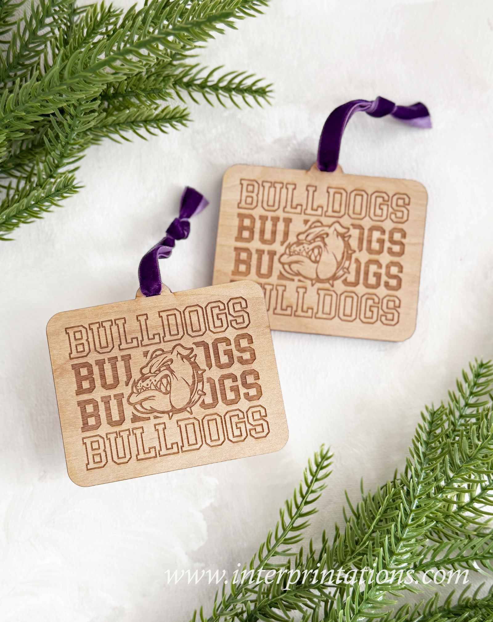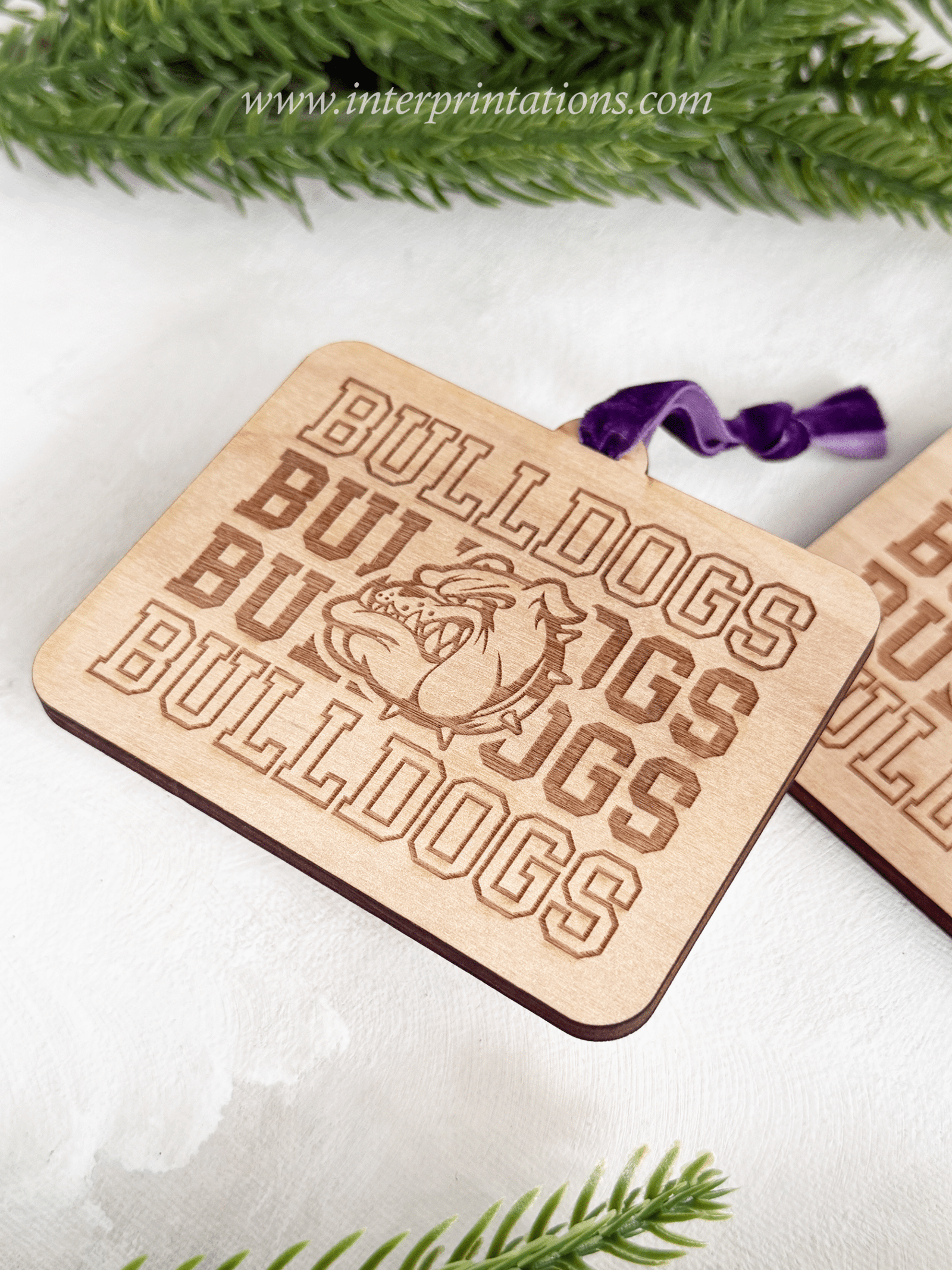 Laser-engraved on 1/4″ raw birch plywood, this ornament features a bold repeating “BULLDOGS” varsity motif with the mascot centered proudly in the middle. The engraving is crisp, clean, and beautifully detailed — the perfect mix of modern and timeless.