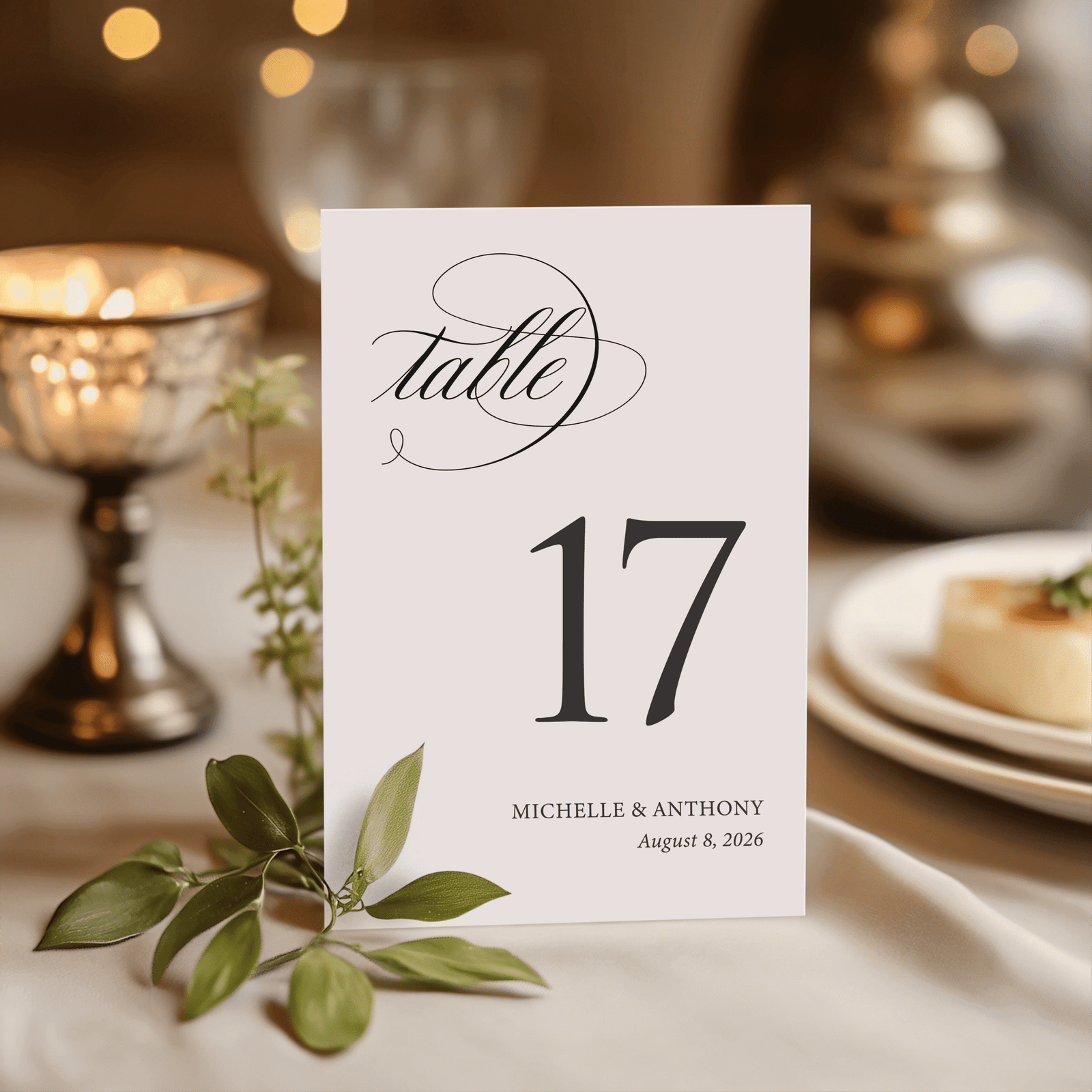Personalize your wedding tablescape with this 4.25″ x 6″ flat table number card, featuring an elegant blend of fonts in a charming layout. Printed in bold black matte ink and double-sided for easy visibility, this timeless design is perfect for weddings and formal celebrations.