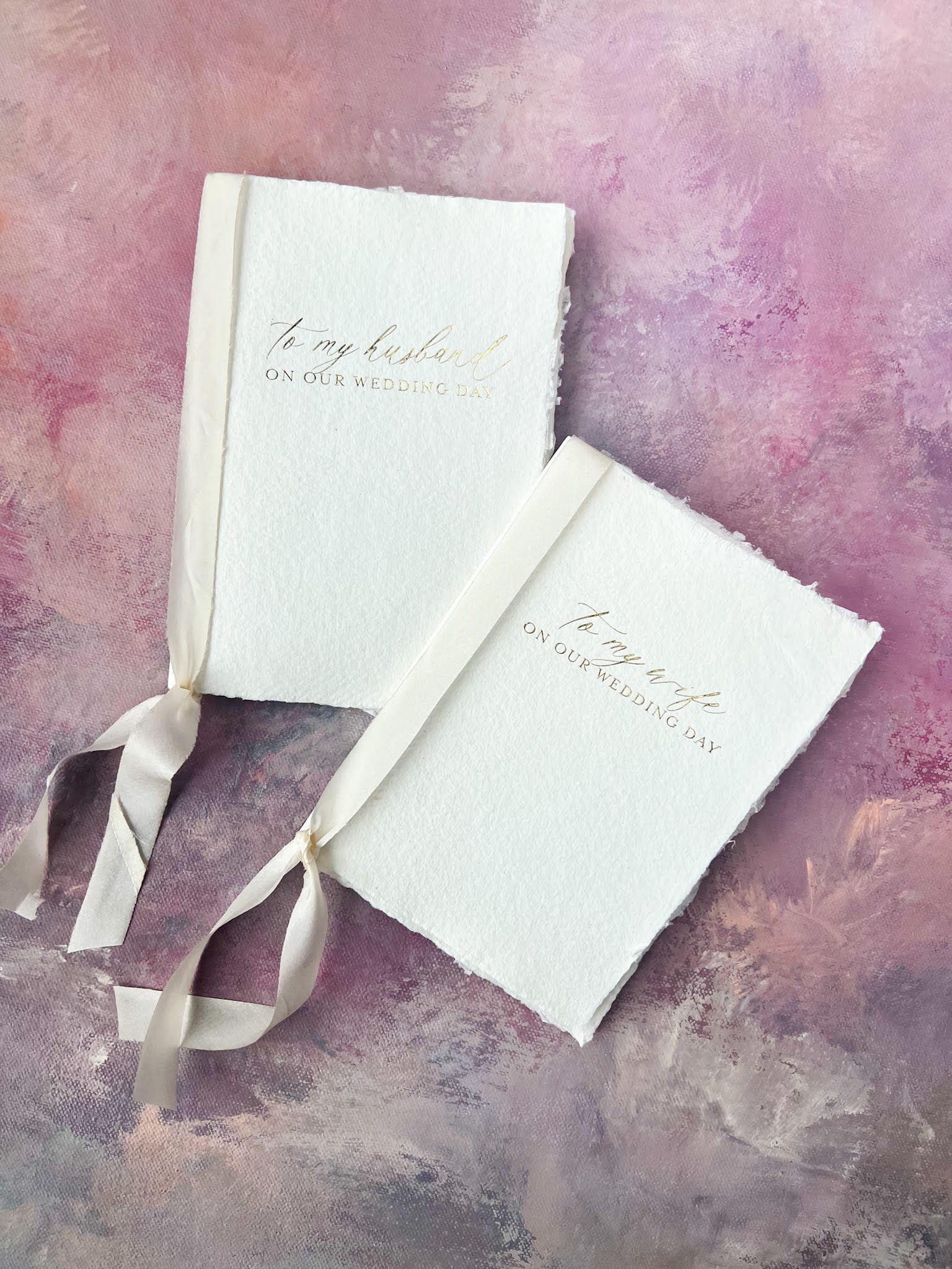 These custom wedding vow books feature gold foil stamping on natural white handmade paper. The booklets are timeless keepsakes, adding another level of romance to your special day.