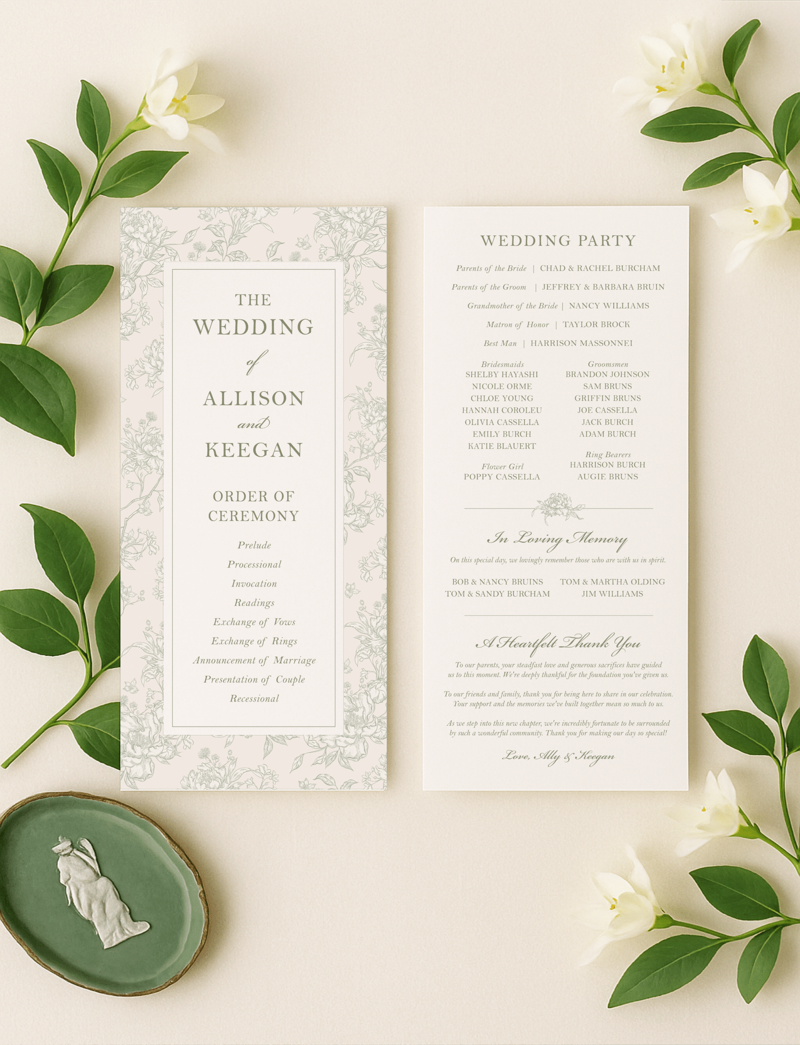 The double-sided format card allows for ample ceremony details, your wedding party, and many other wedding details that you’d like to relay to your guests. The finished size of each card is approx. 4″ x 10″.