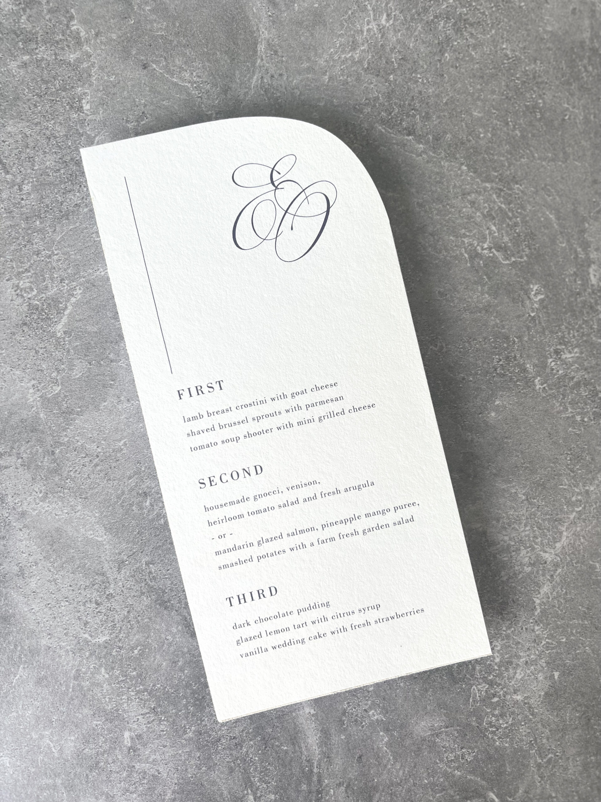 Printed on luxurious cotton cardstock, each menu showcases a left-justified layout with clean, contemporary typography — the perfect balance of fine art elegance and modern minimalism.